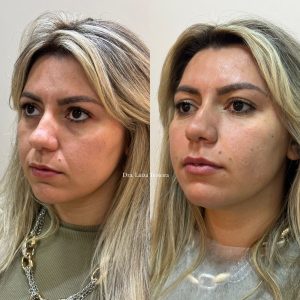 O tratamento começou com a abordagem das olheiras, um aspecto que pode afetar a aparência jovem e descansada da pele ao redor dos olhos. Utilizando técnicas avançadas de preenchimento e revitalização, amenizando as olheiras da paciente, proporcionando uma aparência mais radiante e rejuvenescida. Em seguida, nosso foco foi em reduzir o “bigode chinês”, sem comprometer a expressão natural do rosto da paciente.