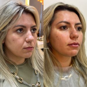 O tratamento começou com a abordagem das olheiras, um aspecto que pode afetar a aparência jovem e descansada da pele ao redor dos olhos. Utilizando técnicas avançadas de preenchimento e revitalização, amenizando as olheiras da paciente, proporcionando uma aparência mais radiante e rejuvenescida. Em seguida, nosso foco foi em reduzir o “bigode chinês”, sem comprometer a expressão natural do rosto da paciente.